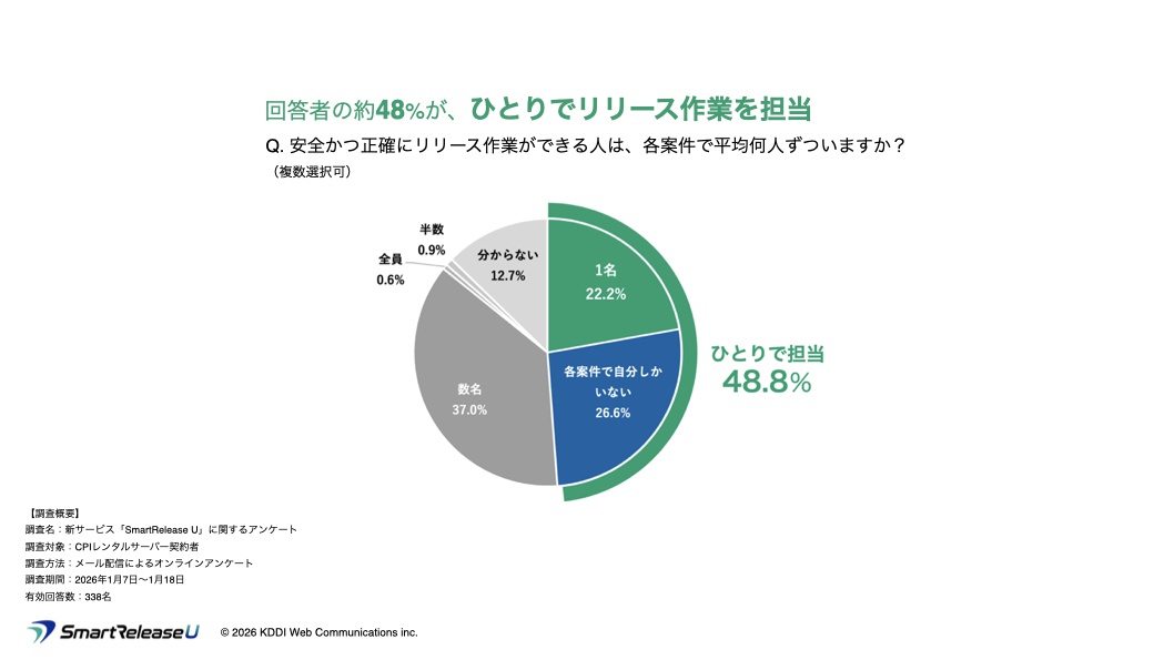 加えて、小規模な制作体制では担当者が1名のみというケースも多く、こうした状況が重なることでリリース作業が一部の担当者に集中しやすくなっています。調査結果でも、48.8%の企業において「本番作業を安全にできる担当者が1名のみ」という属人化が生じている現状が浮き彫りになりました。