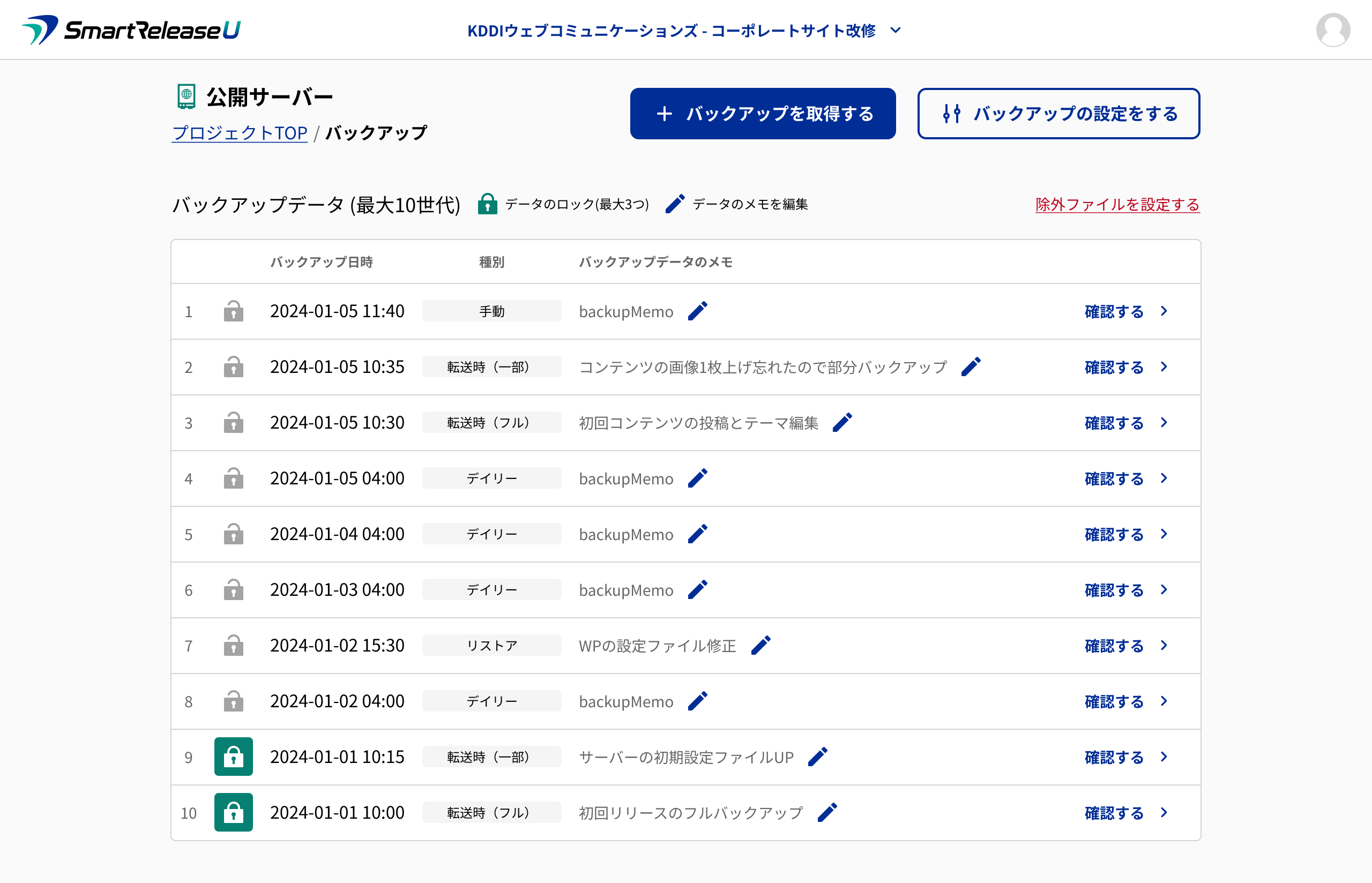 リリース直前に本番サーバーのデータを自動バックアップ。定期的な自動バックアップ(デイリーバックアップ)・手動バックアップにも対応し、最大10世代分まで保存可能です。バックアップデータを元にクリック操作で簡単にリストアができ、想定外のトラブル時でも迅速に復旧できます。